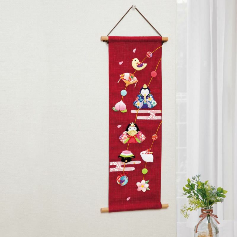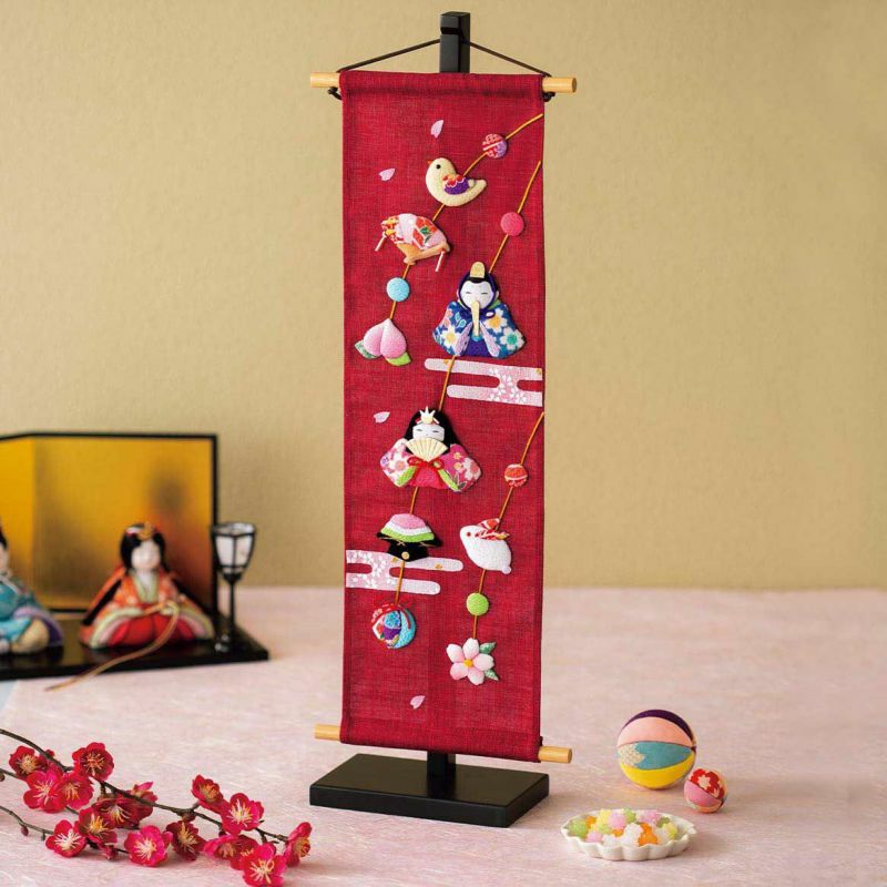 雛人形の脇飾りとして活用できるタペストリーです。別売りの「タペストリー用つるし台」にかけて飾ることができます。