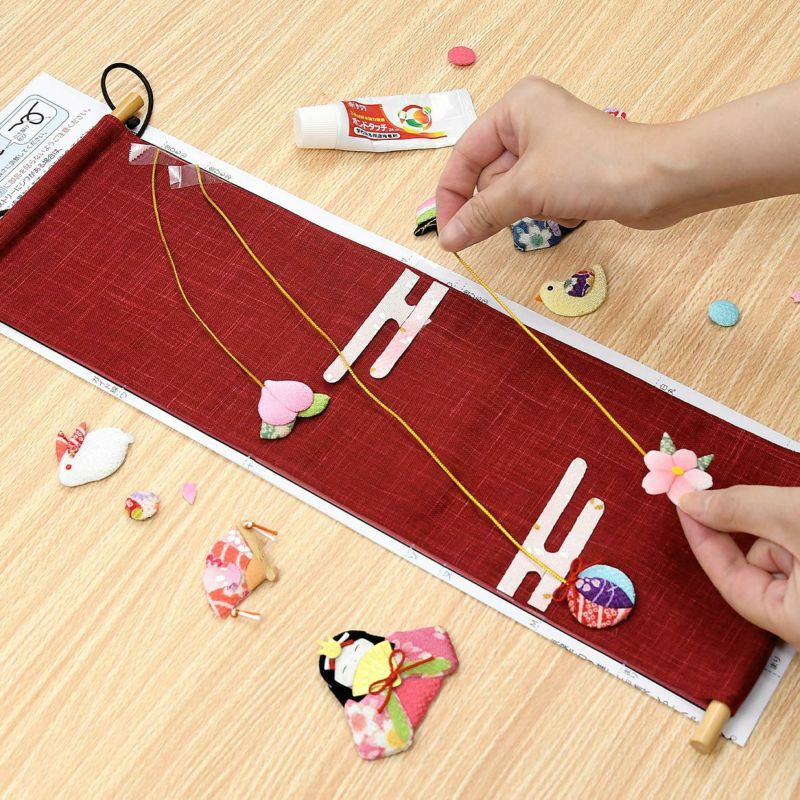 19枚のちりめん生地を使用してカラフルなつるし雛を作ります。モチーフが出来あがっていく工程も楽しいです。