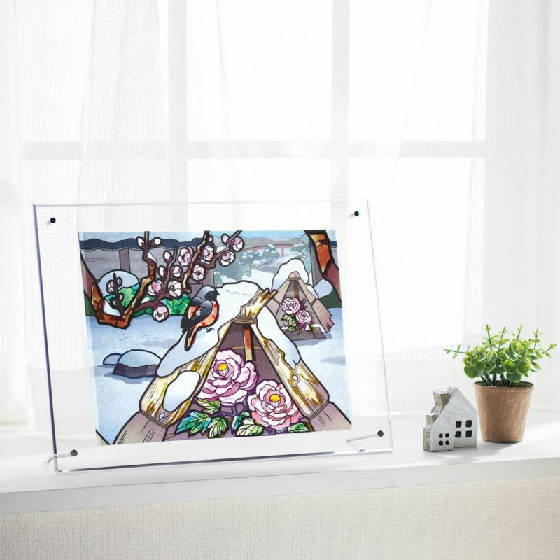 アクリルフレームに入れていただくと、透明感のある絵画のインテリアとしてお楽しみいただけます。日の光が当たる窓辺や、お部屋のライト前などにオススメです。