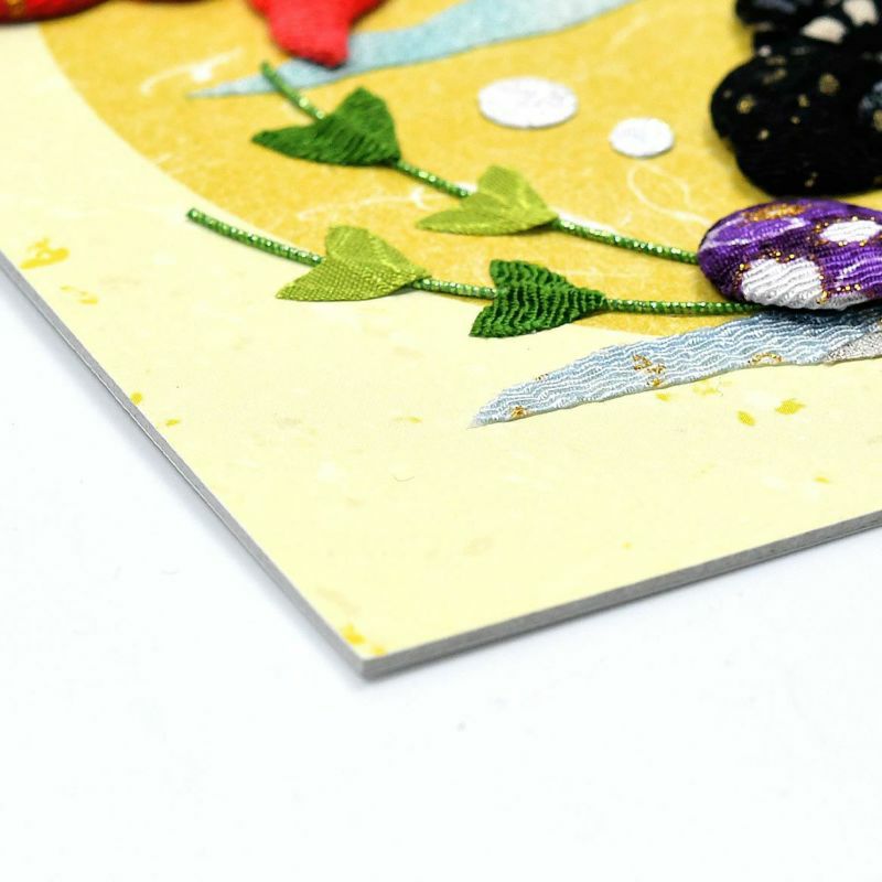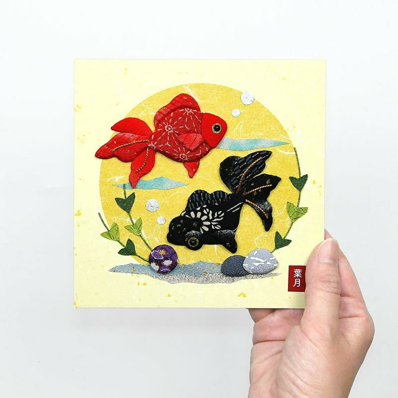 はり出した目がチャームポイントの出目金と丸みを帯びた体型と優雅なヒレが特徴的な琉金を、押絵でふっくらと仕上げます。