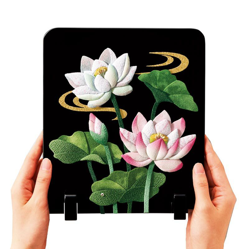 高級感のある黒地の衝立に上品で美しい蓮の花が映えます。玄関やお部屋に飾るとその空間を爽やかに彩ってくれます。