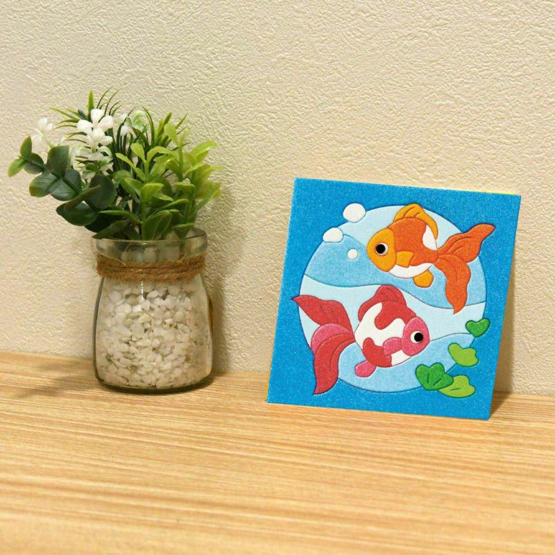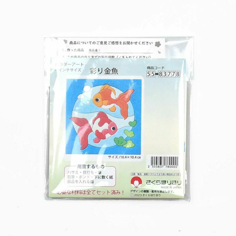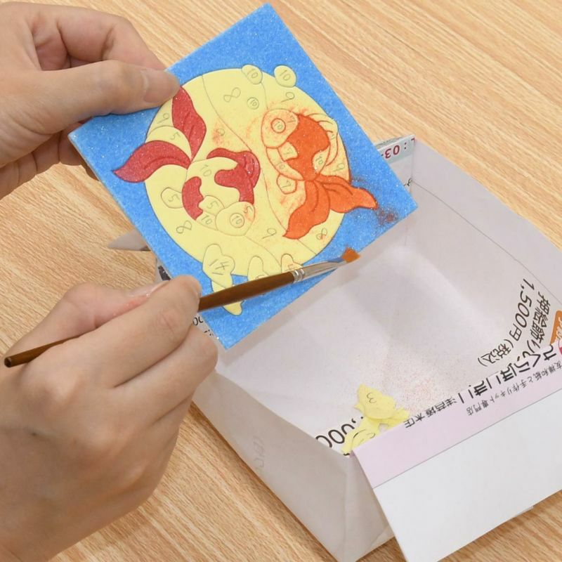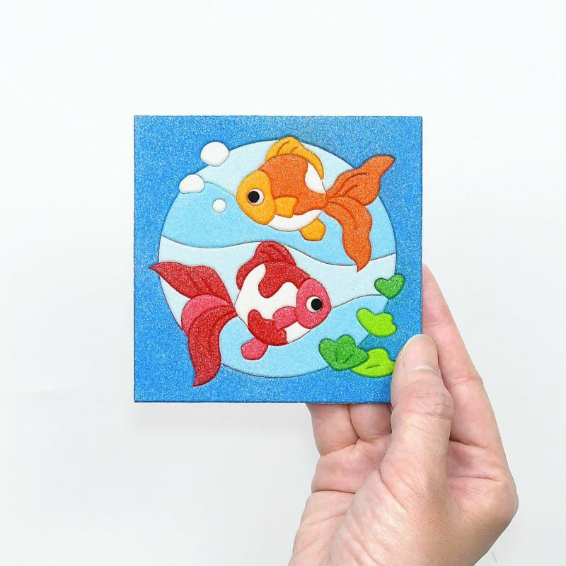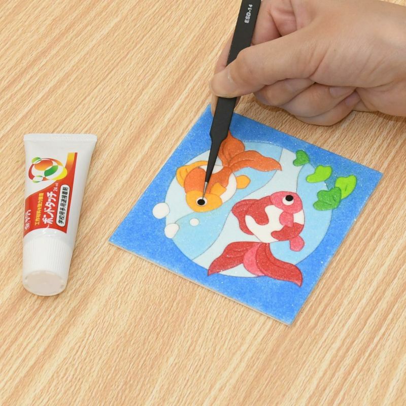 色が美しく、キラキラとしたオリジナルパウダーをかけて絵を描きます。金魚の目のみ付属のフェルトをボンドで貼ります。