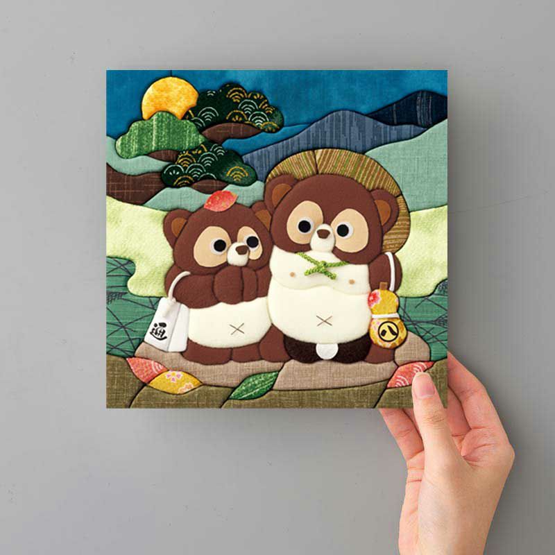 ふわふわのわた布で仕上げる、温もりある雰囲気の仲良く寄り添う夫婦たぬき。別売りの額に入れるとより作品が際立ちます。