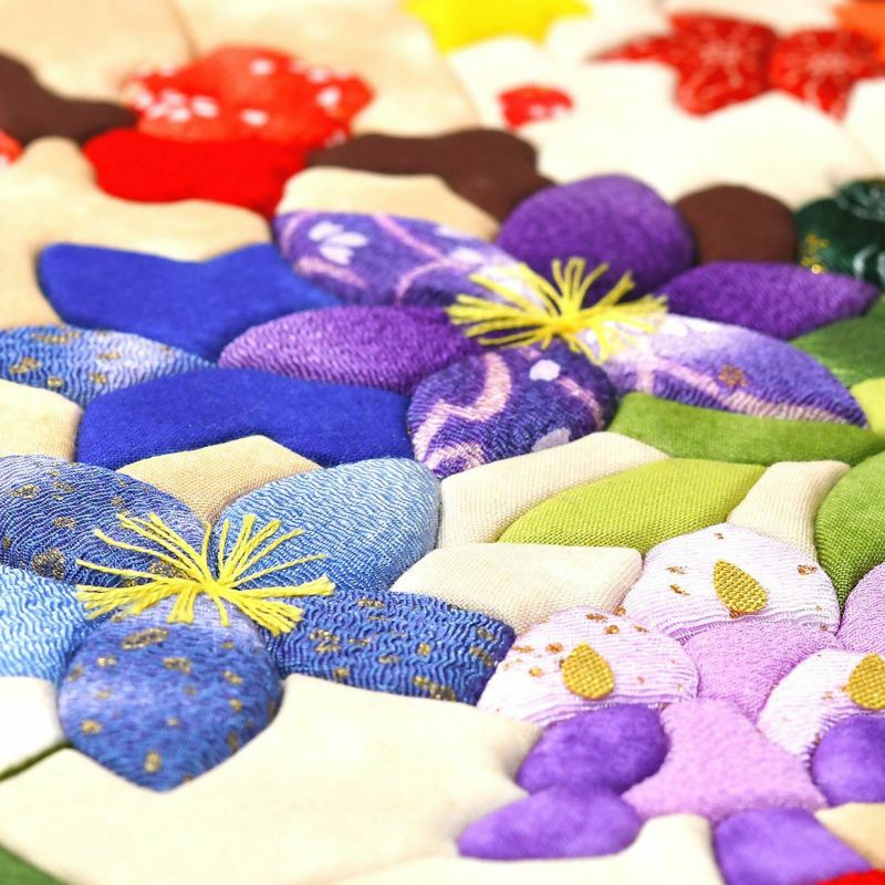きめこみパッチワークではあまり登場しない藤の花をきめこむので、作り慣れている方でも新鮮な気持ちでお楽しみいただけます。