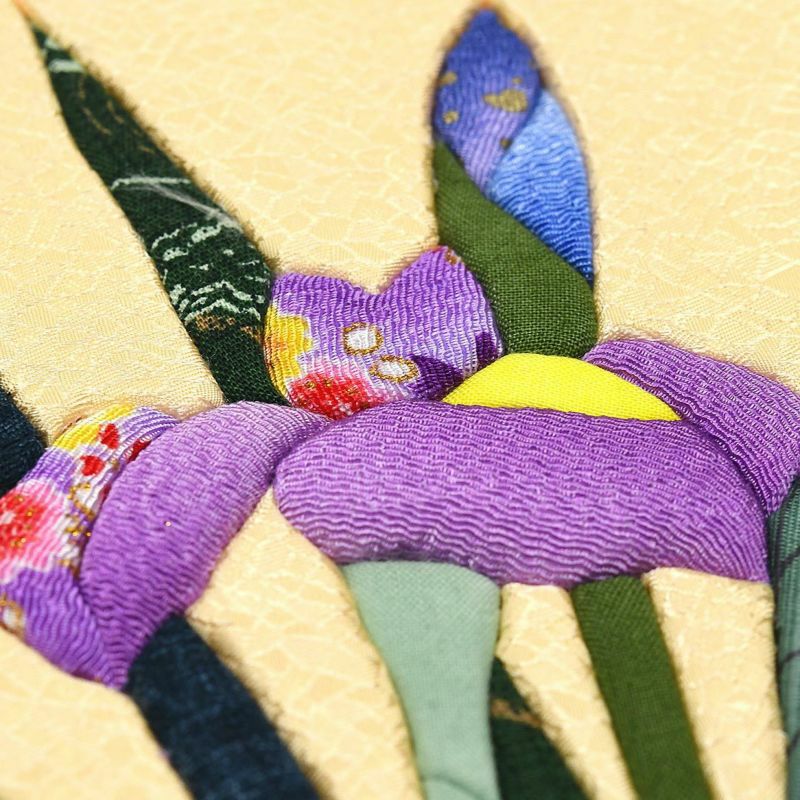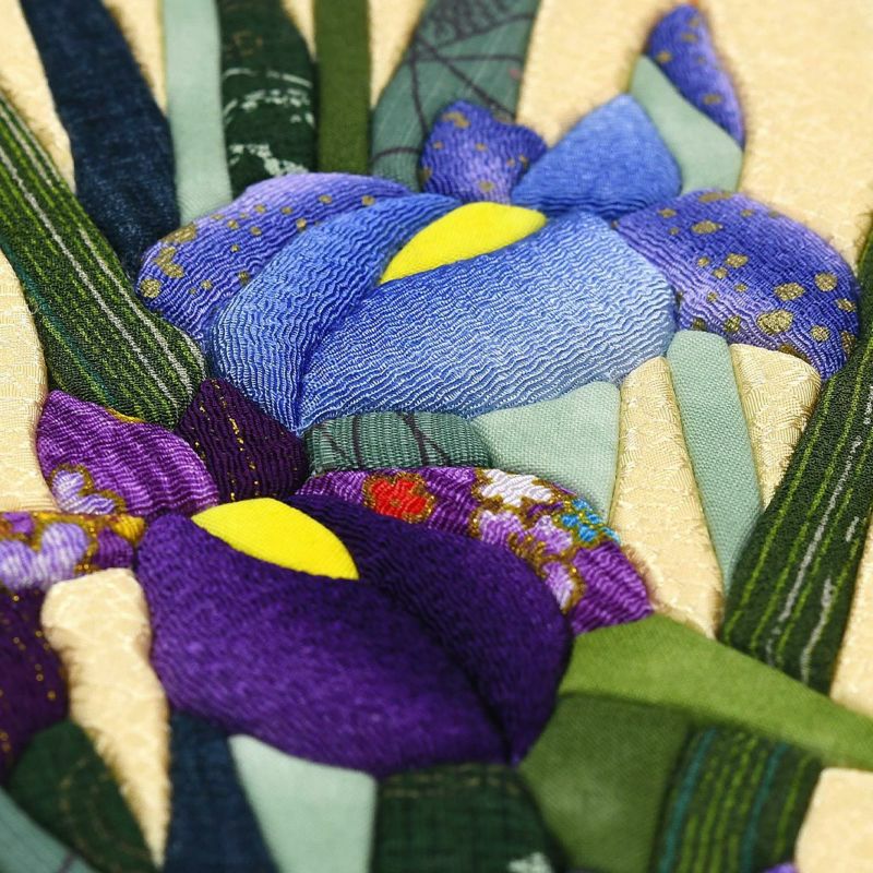 ちりめん布や和布など素材の異なる布を20枚も使い、単調になり過ぎずお部屋に馴染む上品な菖蒲を表現します。