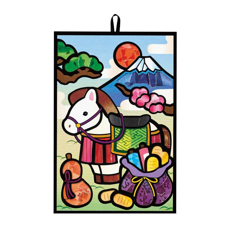 おすまし顔の可愛らしい飾り馬と豪華な縁起物の絵柄。付属の紐をつけて、壁に飾ってお楽しみいただけます。