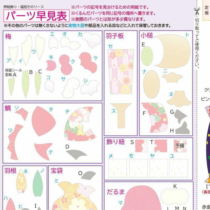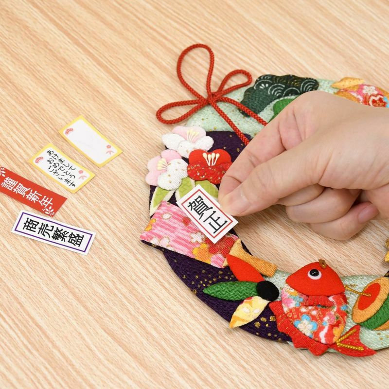 羽子板部分には「賀正」「謹賀新年」「おけましておめでとうございます」「商売繁盛」と好きな文字が書ける「無地」の5種類の文字プレートを貼って楽しめます。説明書から切り取って貼ります。
