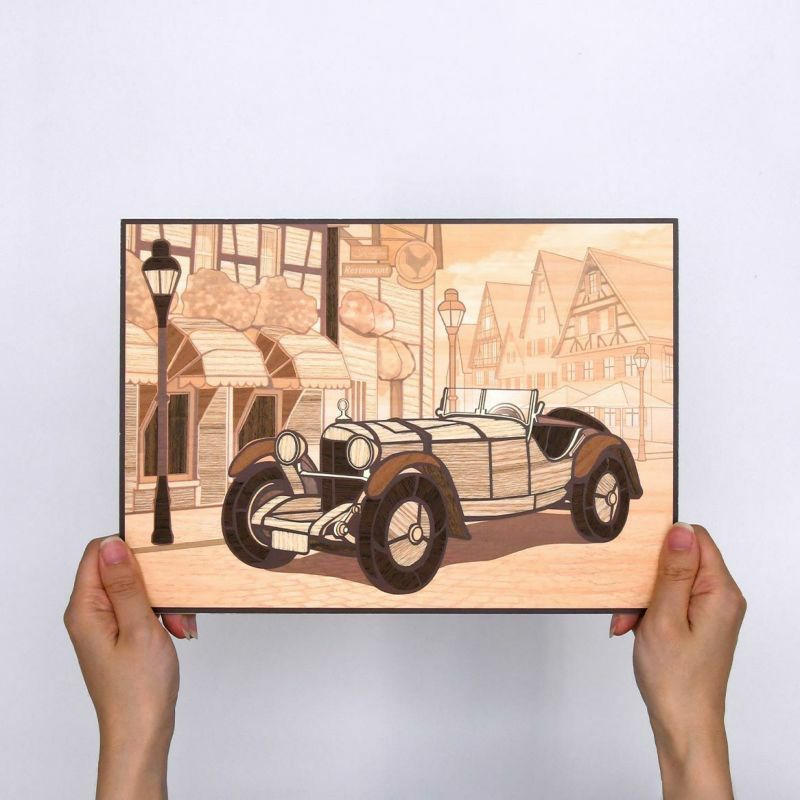 温かみのある木の風合いを生かして表現した中世ドイツのロマンチック街道の町並み。額に入れて飾ると、お部屋のインテリアにもなり素敵です。
