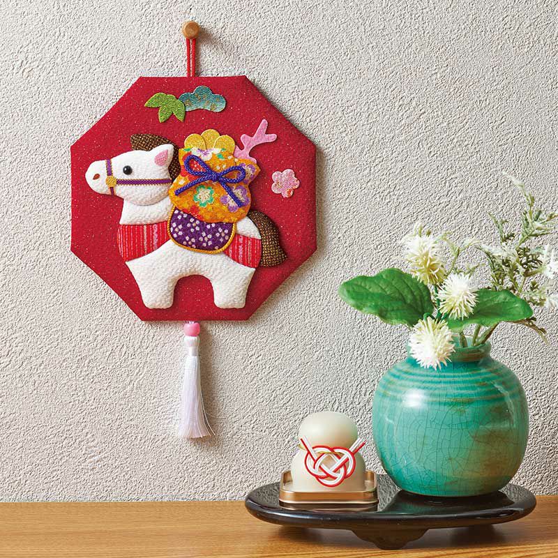 サンゴや小判でいっぱいの宝袋を背負った白馬が可愛らしい押絵。幸福を運ぶ縁起の良いデザインです。房飾りもついているので、簡単ながらも完成度の高い華やかな作品に仕上がります。
