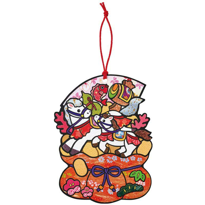 可愛らしい親子のうまと縁起物を集めた絵柄を、お部屋に飾って福を招きませんか。紐付きで手軽に飾ってお楽しみいただけます。