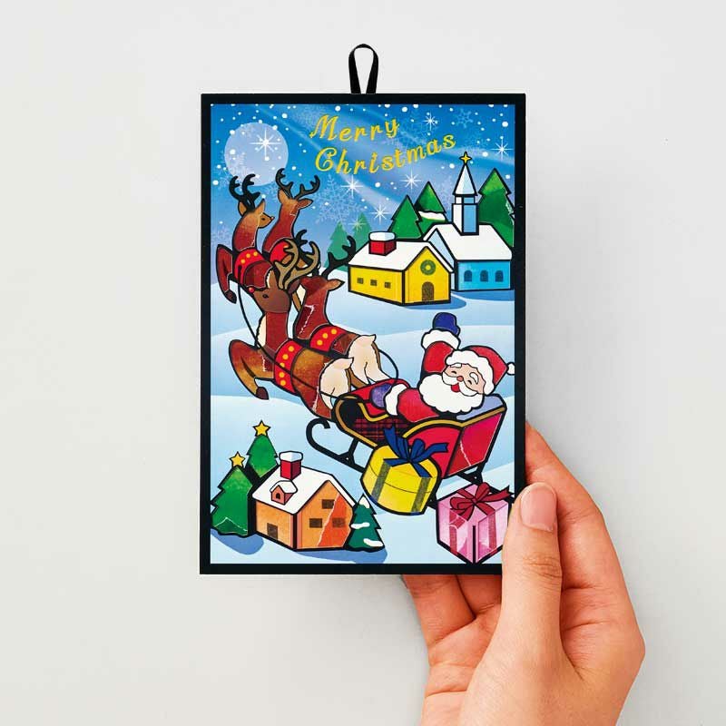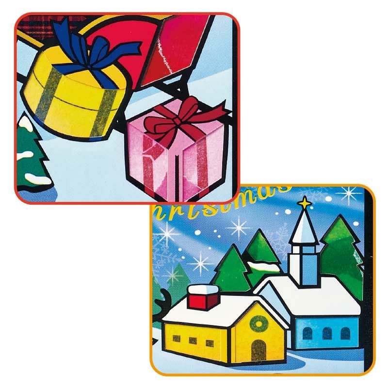 お家の窓やドア、プレゼントの紐、トナカイの足などは下絵にあらかじめ印刷されています。上からシールを貼ると柄が透過するので、細部まで表現することができます。