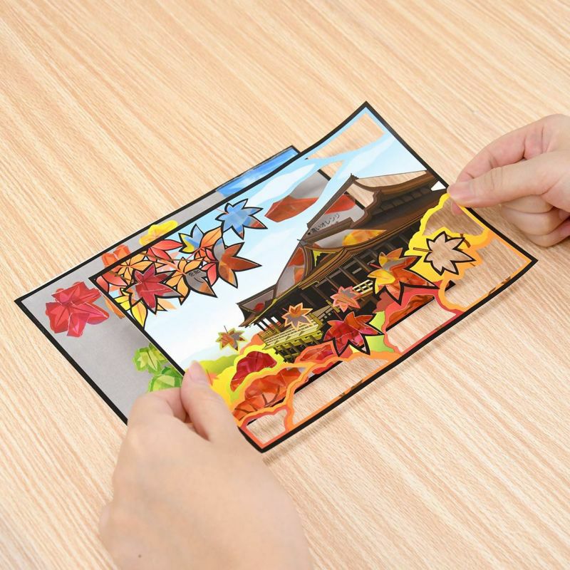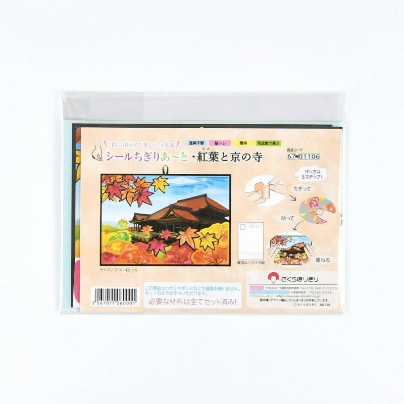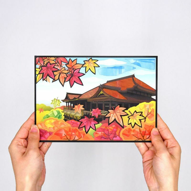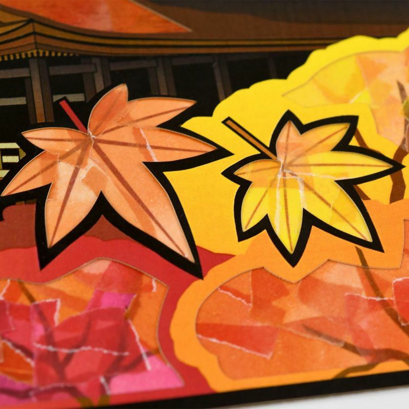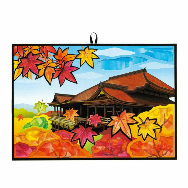 紅葉の葉脈をはじめ清水寺の屋根には、あらかじめ模様が下絵に印刷されています。透け感のあるカラーシールなので、模様が透けて素敵な仕上がりになります。