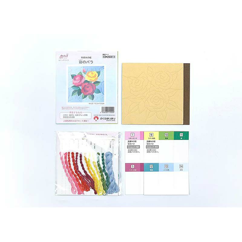 光沢感のあるフランス産の刺しゅう糸を14色使用して3色のバラを表現します。