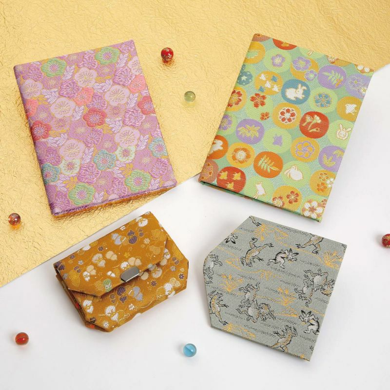 金襴生地で作れる商品は他にも左下の「さくら小銭入れ」に右下の「さくら仮置きマスクケース」があります。