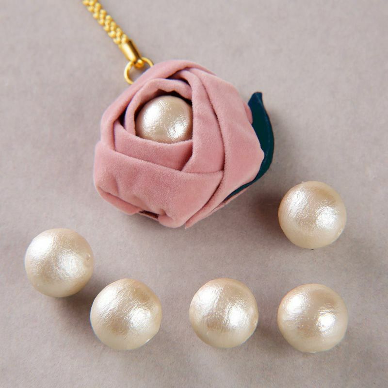花びらの部分には、なめらなか肌触りのベロア生地を使用しています。中央には、光沢の美しいコットンパールを使用しています。