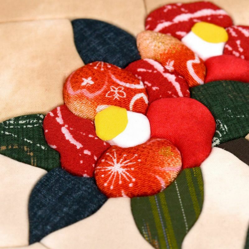 布は全部で16種類使用しています。メインである椿は葉っぱも含め布遊びを楽しめるようにこだわっています。