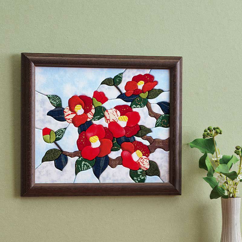 コットン布、ちりめん布、ジャガード、緞子など13種類の布を使用して、椿の花を可憐に仕上げます。