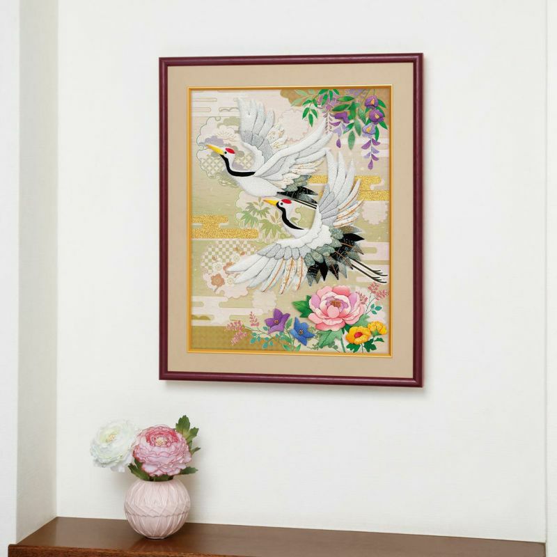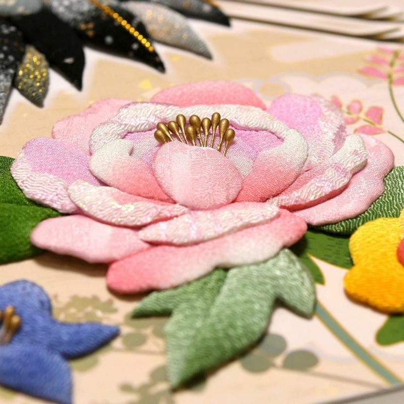 幸福や富の象徴とされる牡丹をはじめ、四季折々の花が咲き誇るデザインは、季節を問わず飾っていただけます。牡丹の花にもラメ入りの生地を使用し、艶やかに咲く大輪の花を表現しています。
