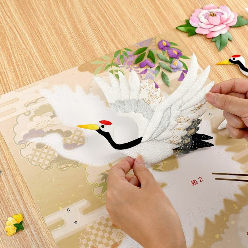 鶴にはラメやレースのついたのちりめん布など珍しい布をはじめ10種もの生地が使われています。立体的で繊細さを表現します。