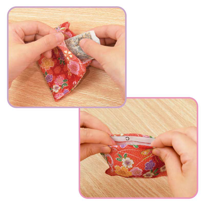 はさみでの「切る」、接着剤での「貼る」、布で部品を「包む」など、基本的な工程を順に進めます。