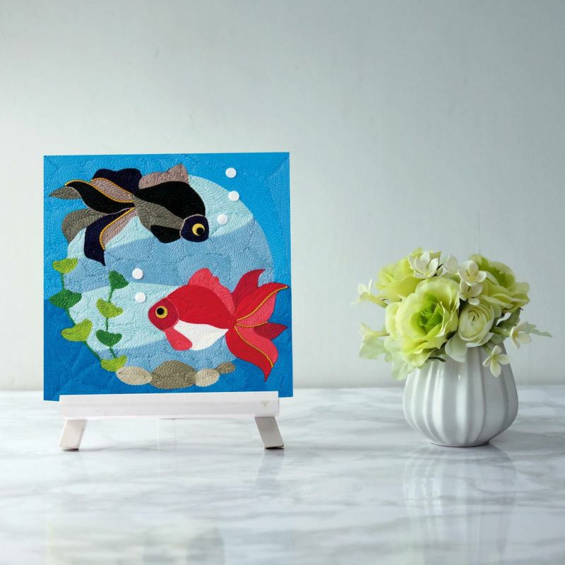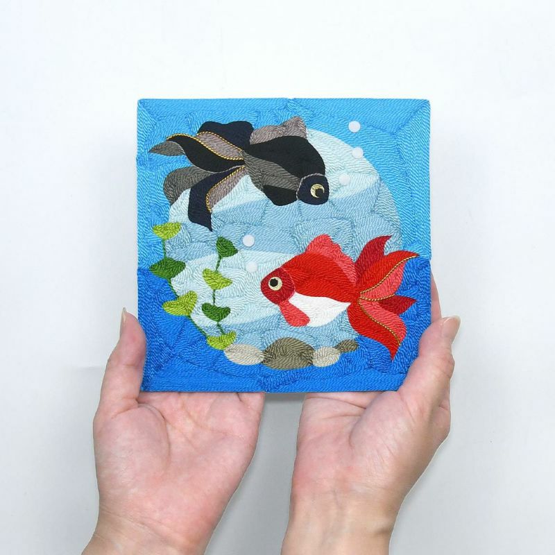 金魚には1匹につき4色の糸を使用して、繊細で上品な色合いになるように表現しています。