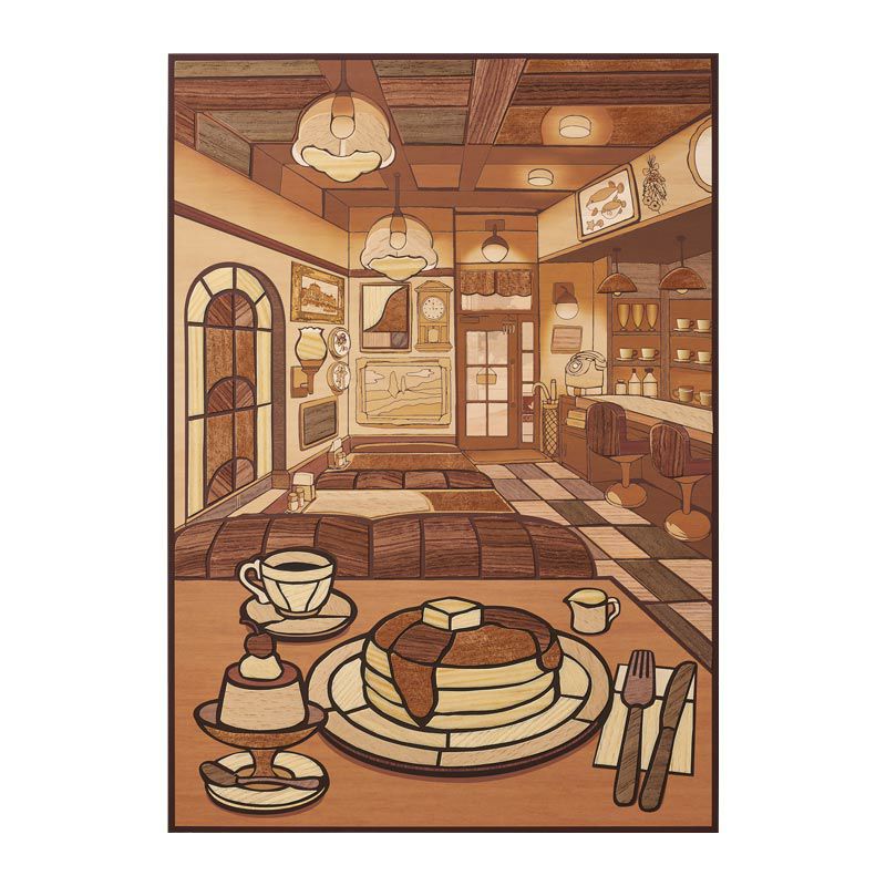 切って貼るだけのかんたんな工程で、本格的な絵が作れるさくらあーと。ステンドグラスの窓にランプの照明、公衆電話…昔行った「あのお店」を思い起こすようなどこか懐かしい喫茶店を、温かみのある木のシートで表現します。セピアカラーのレトロな雰囲気でお部屋のインテリアにおすすめです。