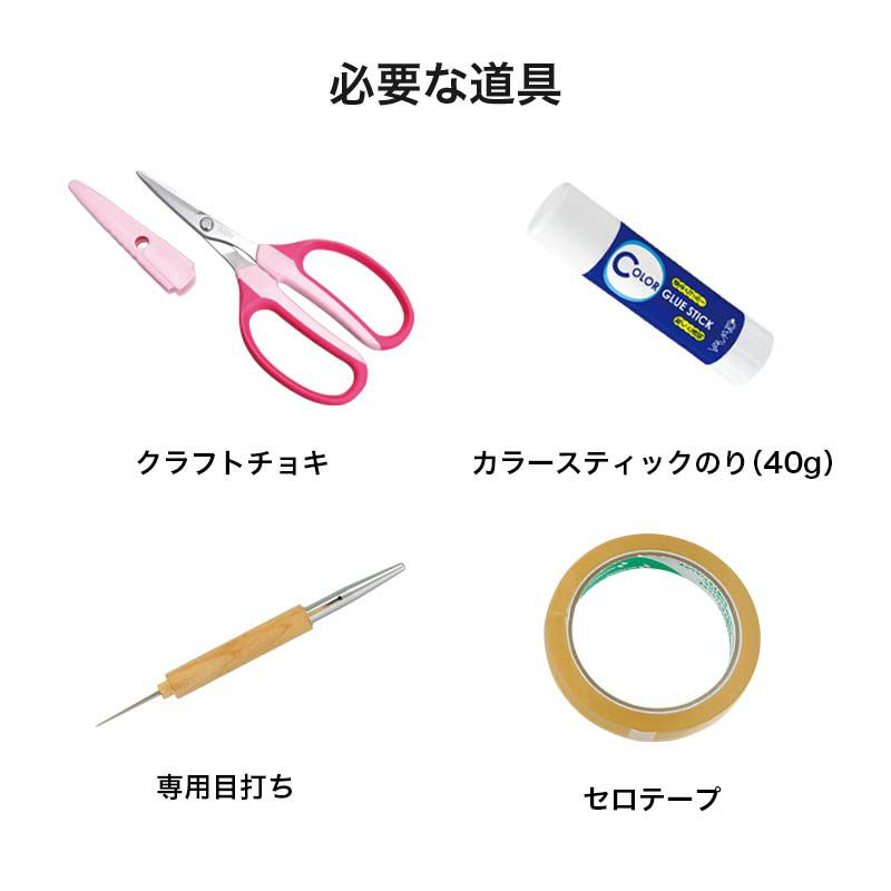 - クラフトチョキ、セロテープ、カラースティックのり、専用目打ち、ホチキス