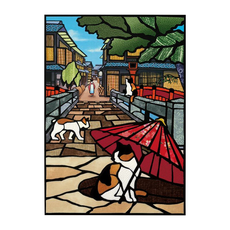 祇園白川の日本の美を感じる情景に鮮やかな唐笠の色が映えます。別売りの額に入れることでより作品が際立ちます。