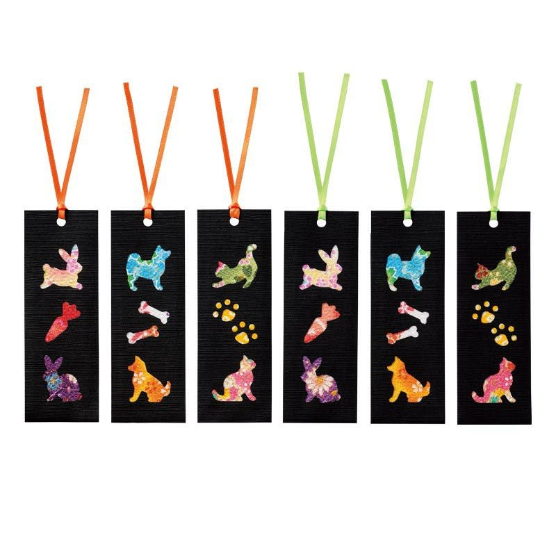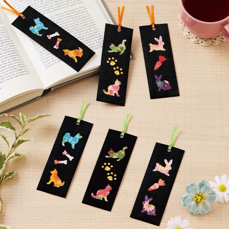 ちりめん布で彩る動物たちが、黒色のシートに鮮やかに映えるしおりの6枚セット。実用的なので作ったあとも使って楽しむことができます。