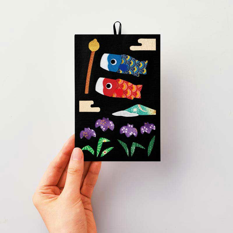 ちりめん布の色が目を引く絵柄が、黒の型抜きボードに鮮やかに映えます。可愛らしい2匹の鯉のぼりの姿に思わず笑みがこぼれます。