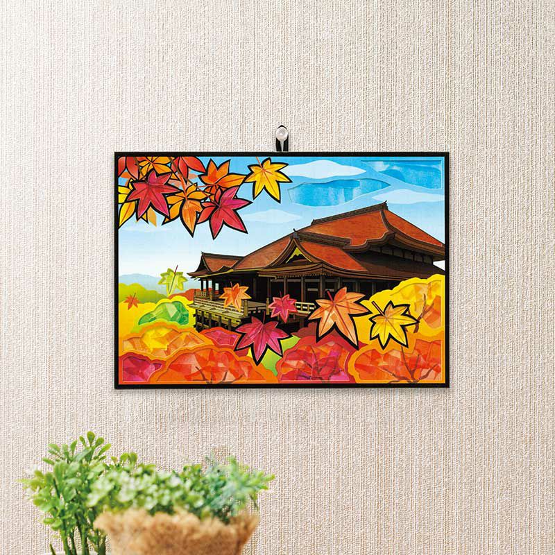 紅葉の葉脈をはじめ清水寺の屋根には、あらかじめ模様が下絵に印刷されています。透け感のあるカラーシールなので、模様が透けて素敵な仕上がりになります。