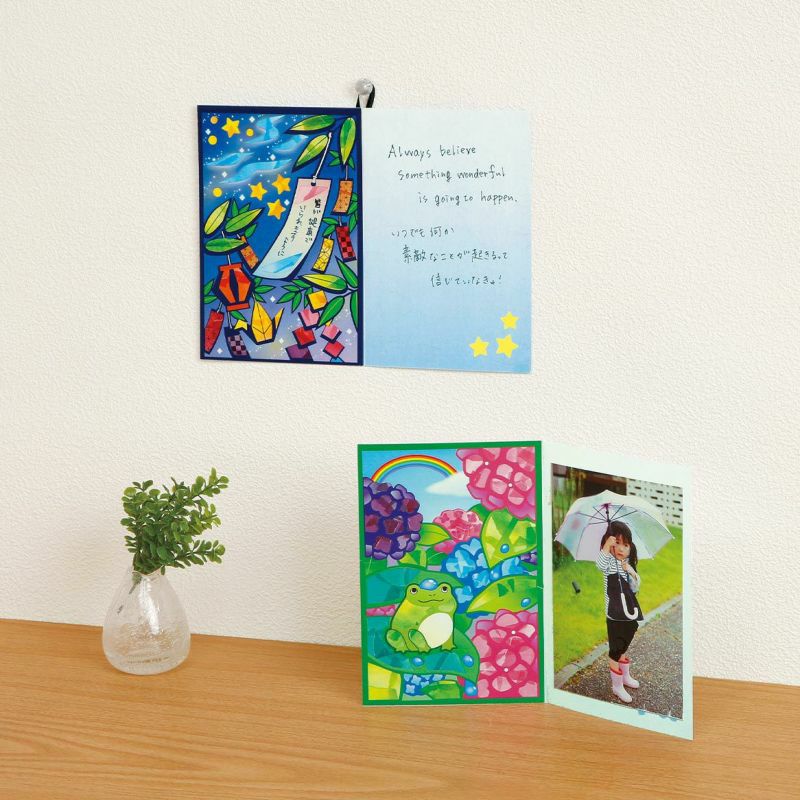 そのまま立てて飾ることも、付属の飾り紐で壁にかけることもできます。右側にお好きな言葉を書いたり、写真などを貼ってお楽しみください。