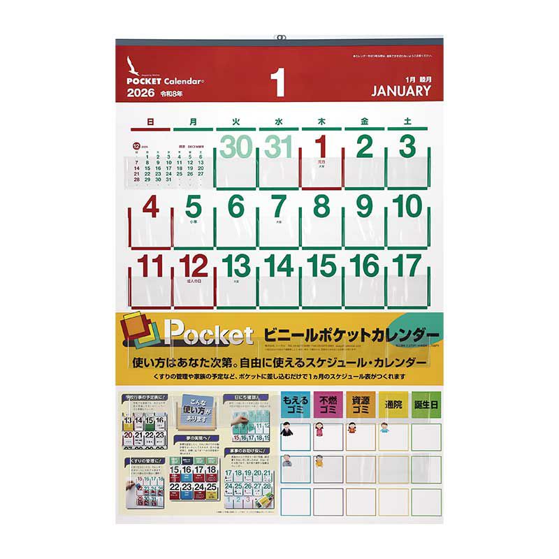 一番上のビニールポケットにメモを入れるだけで簡単にスケジュールがわかるカレンダーです。