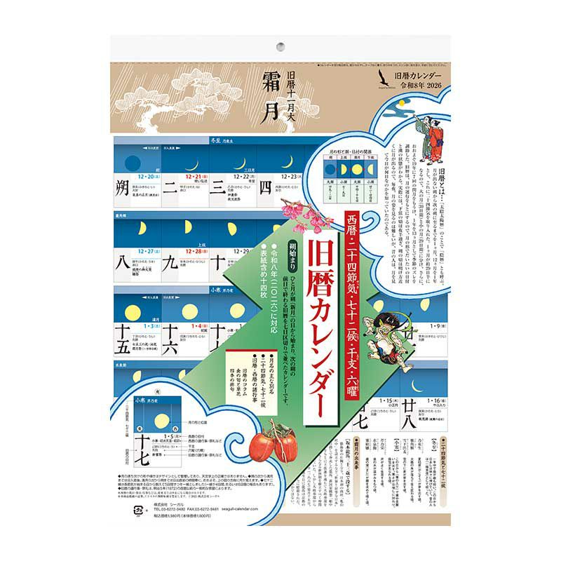 旧暦も併記した季節を感じるカレンダーです。二十四節気、七十二候を中心に、旬の食べ物、伝統行事や日本のしきたりなどを解説。俳句・お茶など『和』を楽しむ方、必携です!