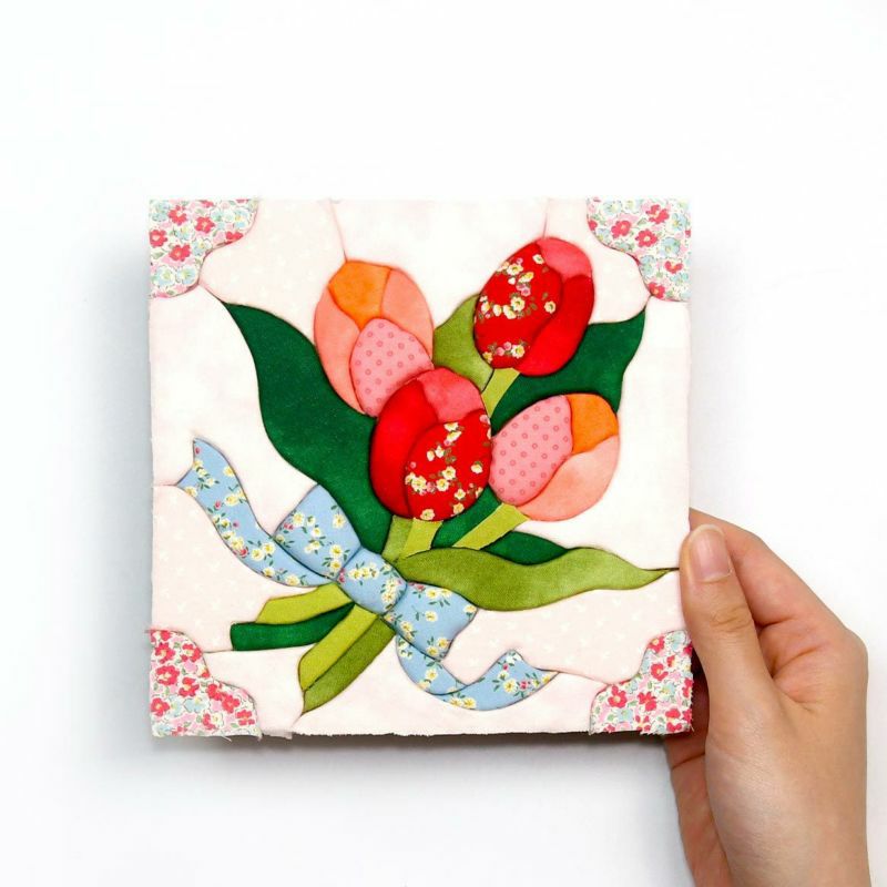13枚の鮮やかで可愛らしい布を使って作ります。すべてきめこみやすいコットン生地なので、初めての方でも安心して作れます。
