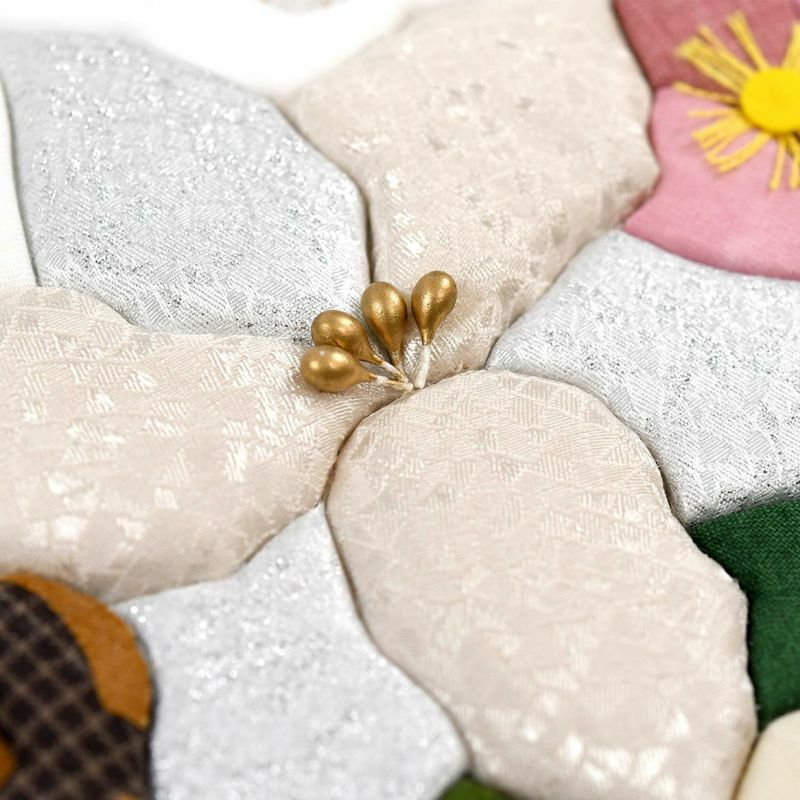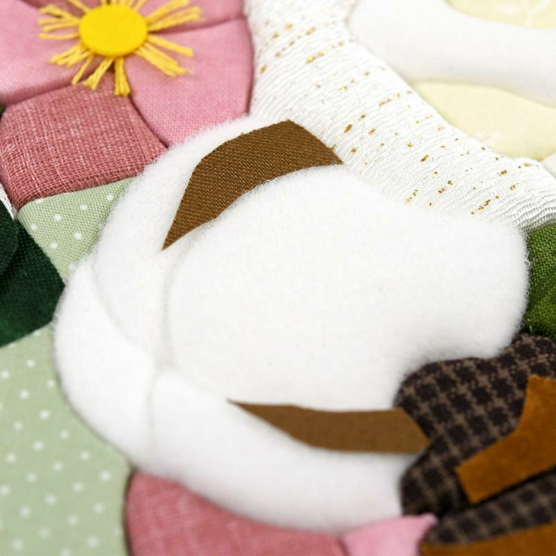 バラ、ポインセチア、綿花と白い花をメインにまとめました。同じ白でも布の素材や種類を変えて、それぞれに違いを出しています。