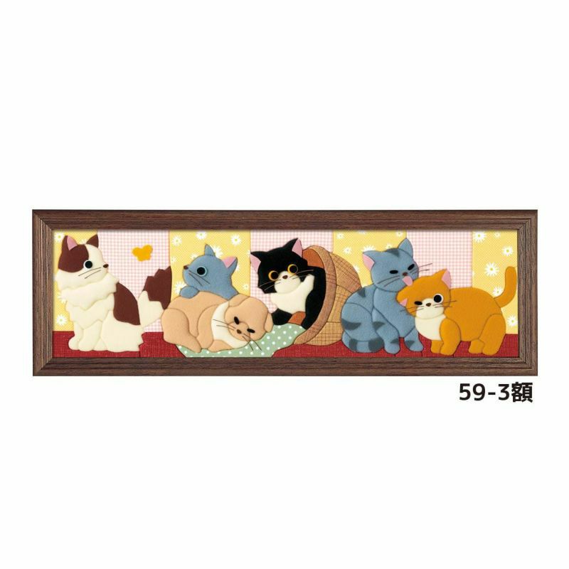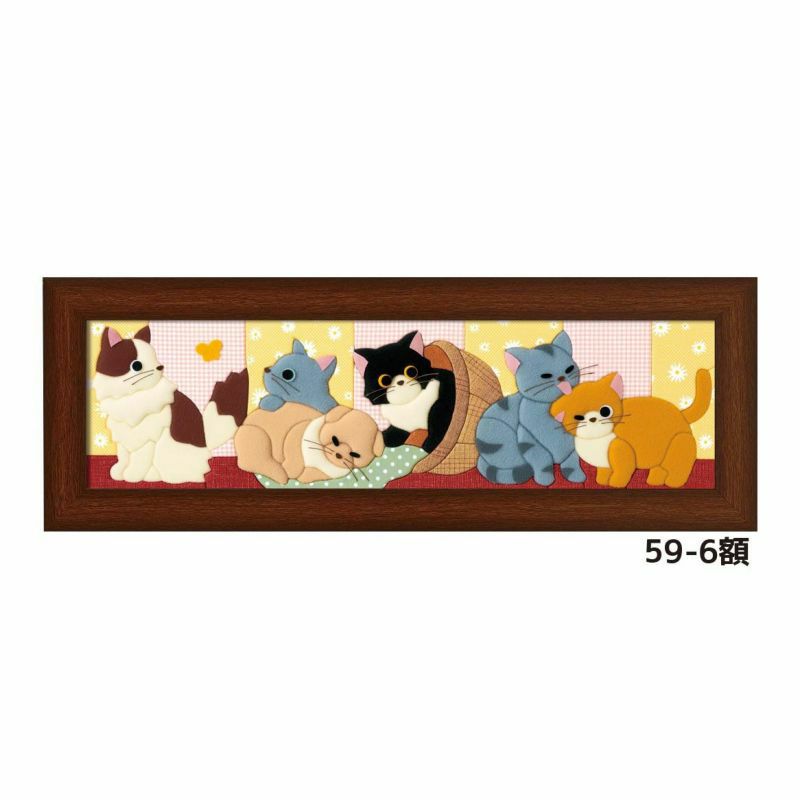 猫たちの可愛らしいしぐさと表情が詰まった絵柄をお部屋に飾ると癒しのひとときを感じます。 額装イメージ(59-6額)