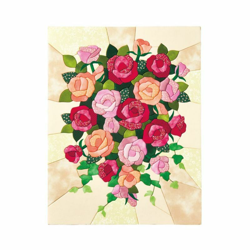 バラは、赤・サーモンピンク・ピンクと3色でまとめました。部分的に柄布を使っているのでパッチワーク的な布遊びを楽しめます。