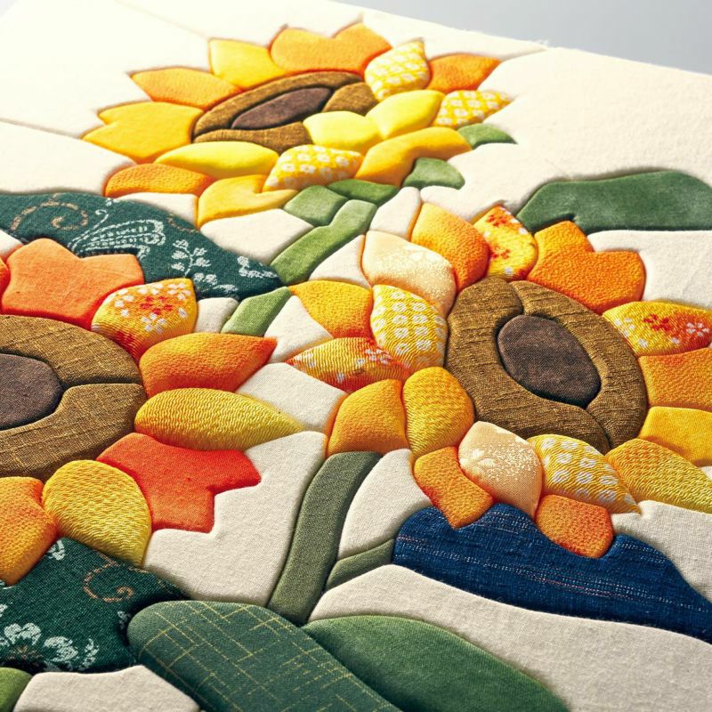 ひまわりを8種類の布を使って繊細に表現するとともに、布を配置を工夫をすることで立体感が出るようにします。