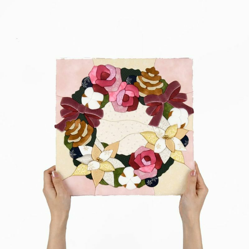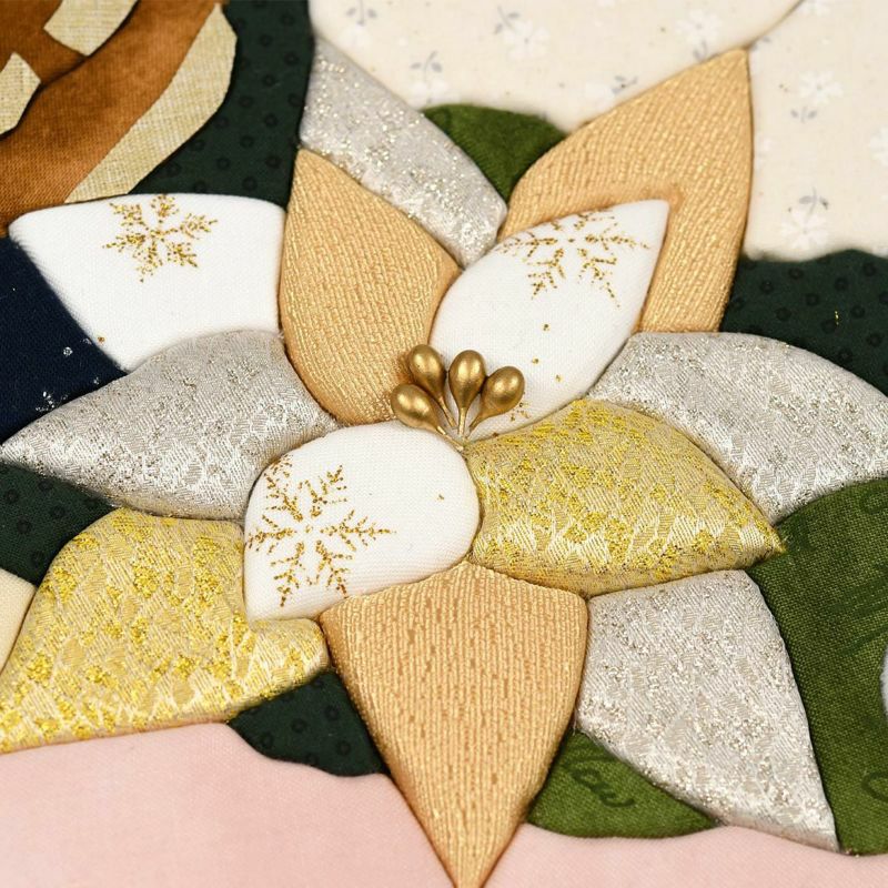 コットン・わた布・ベロア・ジャガードと素材の異なる布を19枚使用しています。きめこみ感覚の違いも楽しめます。