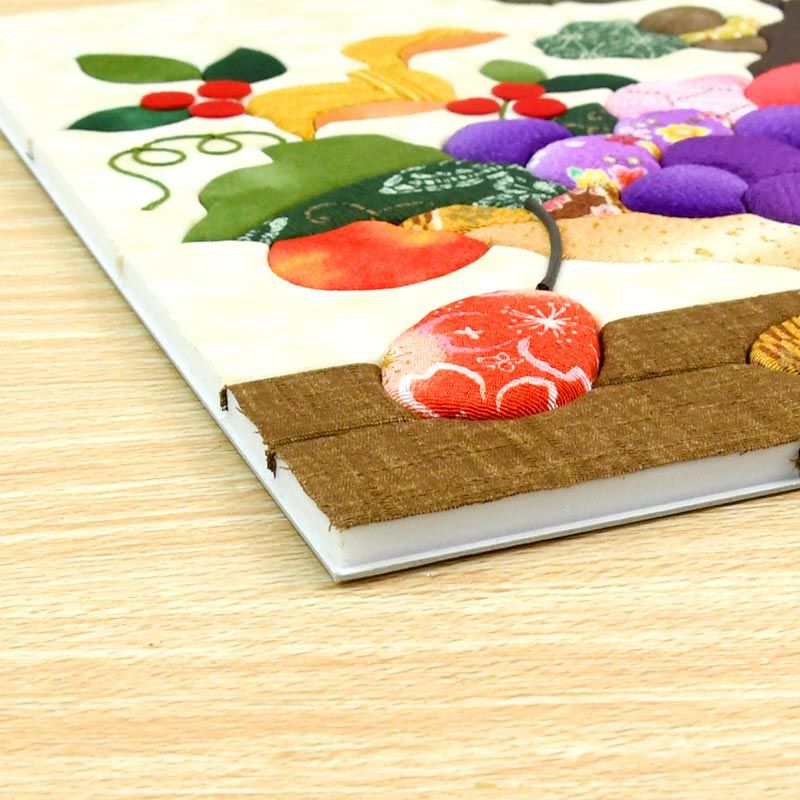 油絵の静物画をイメージした絵柄を、ちりめん布で上品に仕上げます。籠にはぶどう・りんご・洋ナシ・もも・カラスウリ・カシワが盛られ、お部屋に豊かな彩りを添えます。