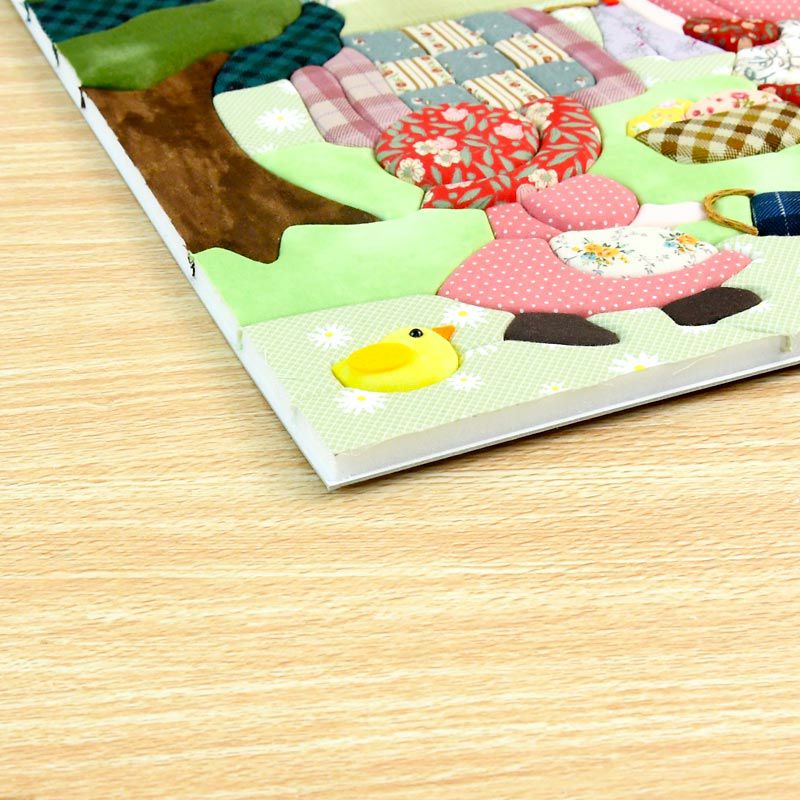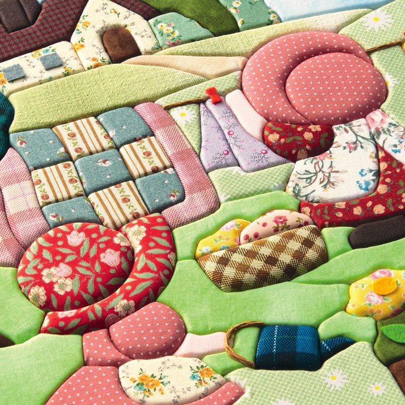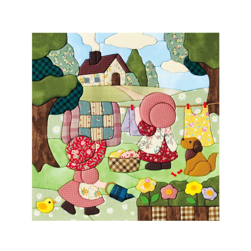 優しい色合いの柄布で彩るカントリー調の絵柄。別売りの額に入れて飾ると、お部屋がホッと心癒される空間に。