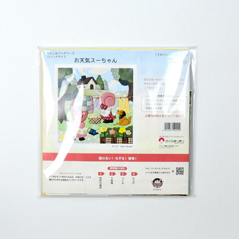 パッチワークキルトのモチーフの中でも人気のあるスーちゃんの絵柄は、イギリスの絵本に書かれた日よけ帽子の女の子から始まったとされます。初めの頃はお母さんが娘の健やかな成長を願って作る、ベッドカバーやおくるみの絵柄として使われていました。可愛いだけでなく思いの詰まった優しい絵柄は、家族への心をこめたプレゼントにもぴったりです。