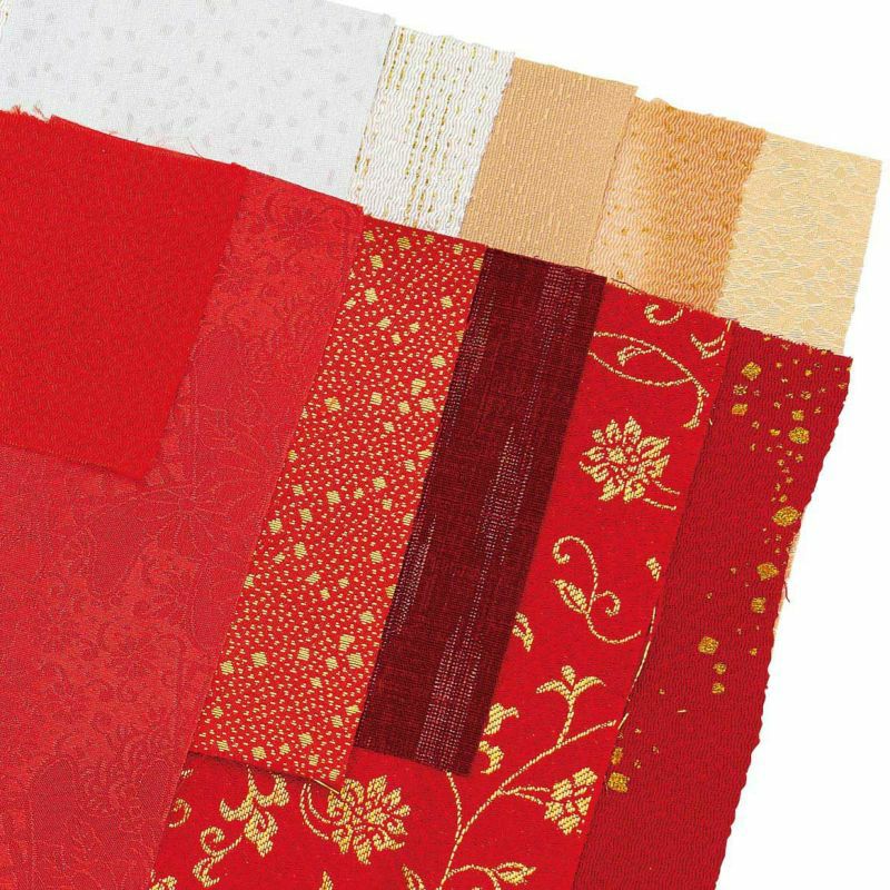 ちりめん布、ジャガード、金襴布と素材の異なる布を11枚使用しています。きめこむ感覚の違いもお楽しみください。