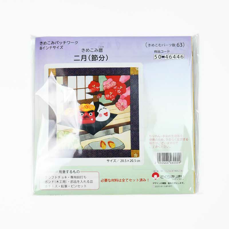 一年を月ごとの風物詩で表現する「歳時記シリーズ」2月は梅がほころぶ様子に春の訪れを予感させる節分の絵柄。豆まきが始まる前の心弾む風景を色柄の楽しい布で表現します。