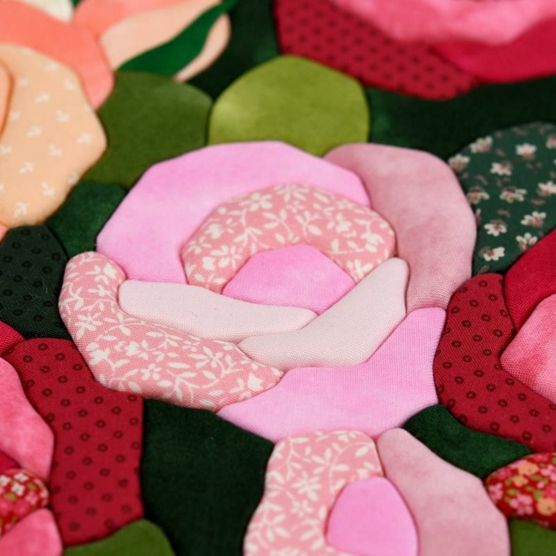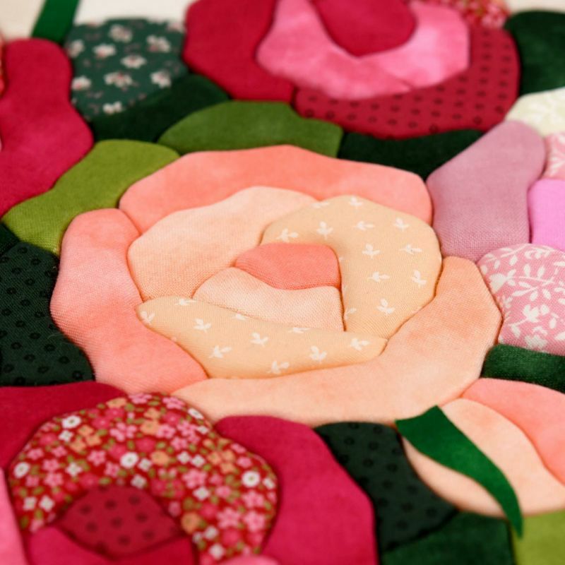 バラは、赤・サーモンピンク・ピンクと3色でまとめました。部分的に柄布を使っているのでパッチワーク的な布遊びを楽しめます。