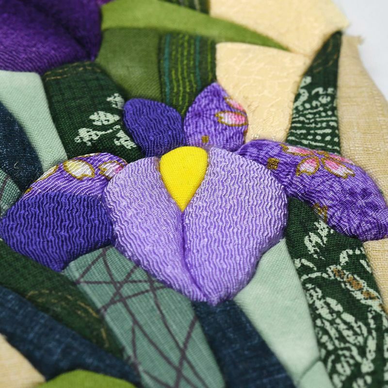 ちりめん布や和布など素材の異なる布を20枚も使い、単調になり過ぎずお部屋に馴染む上品な菖蒲を表現します。