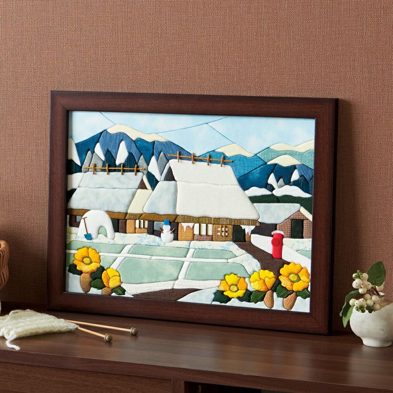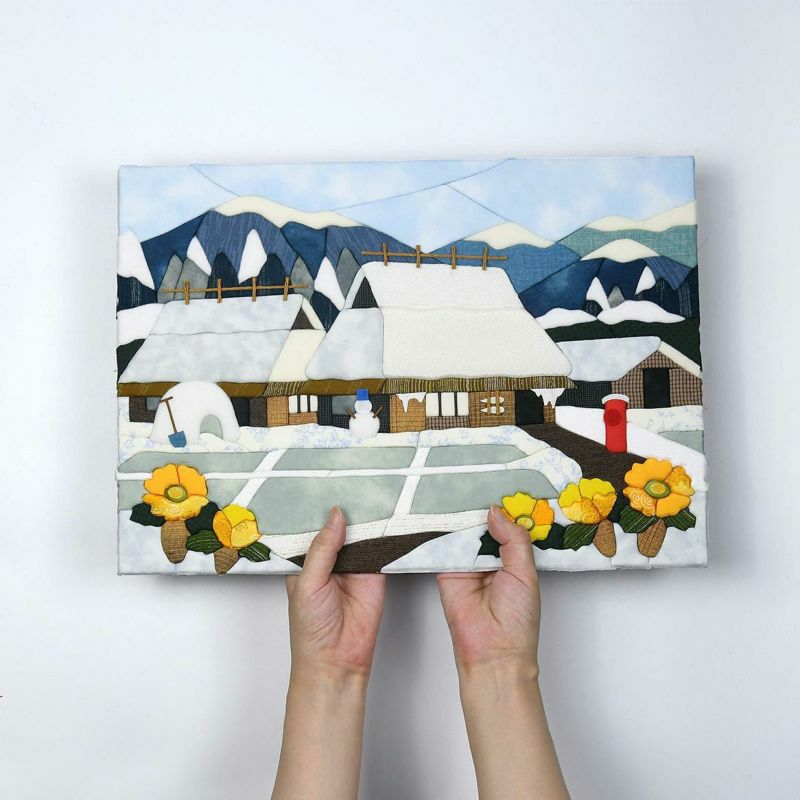 コットン・ちりめん・ジャガード・先染木綿など30種類の布を使って風景を表現します。雪だけでも7種類もの布を使用しています。