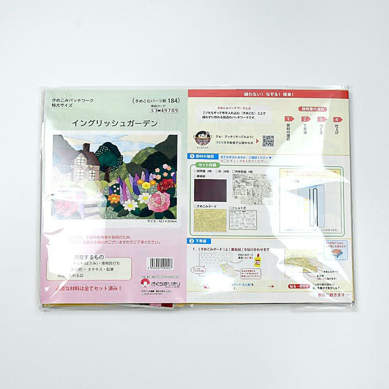 イングリッシュガーデンだからこそ映える布選びで、184個のパーツを一つひとつきめこんでいく楽しさと作りごたえのある作品です。温かみを感じる絵柄に触れながら癒しのひと時を過ごしませんか?