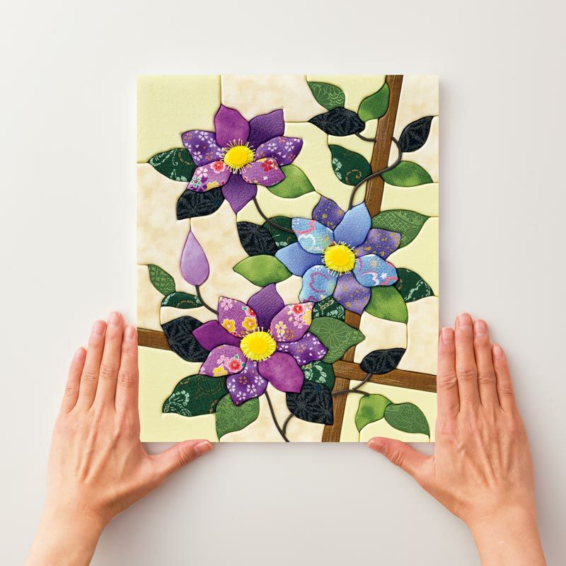 クレマチスらしい伸びやかな姿を表現する、つるの動きがこだわりのポイント。つるを表現するレーヨンコードは、ミゾに沿って貼るので作りやすい仕様です。
